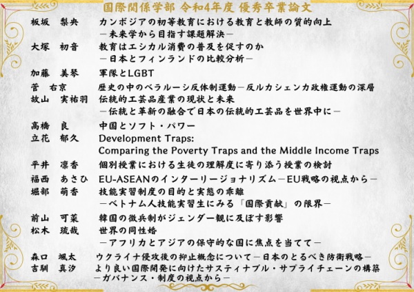 第1期生卒業式当日の3月19日、学位記交付式に引き続き、2022(令和4)年度国際関係学部優秀卒業論文賞表彰式を真理館2階SR204教室にて行いました。