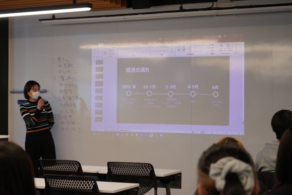 4年次生は、自分の経験を踏まえ、本学の進路・就活支援センターの利用を促したり、SPI対策に具体的な参考書を薦めていました。また、TOEICなどの資格の重要性を説いたりするなど、就職活動を行う上で重要な情報を懸命に伝えていました。