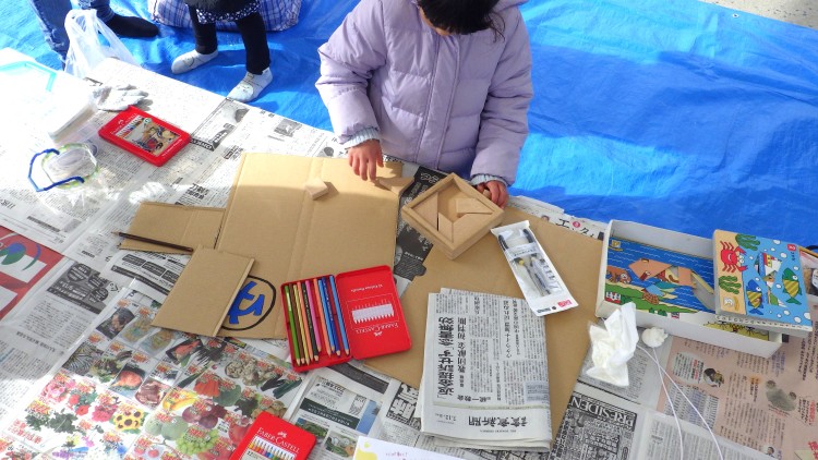 梅小路公園の一角に遊び場を設置し、プレイパークに遊びに来た子どもたちや保護者と、こま回しや木製パズル遊び、お絵かきなどをしました。