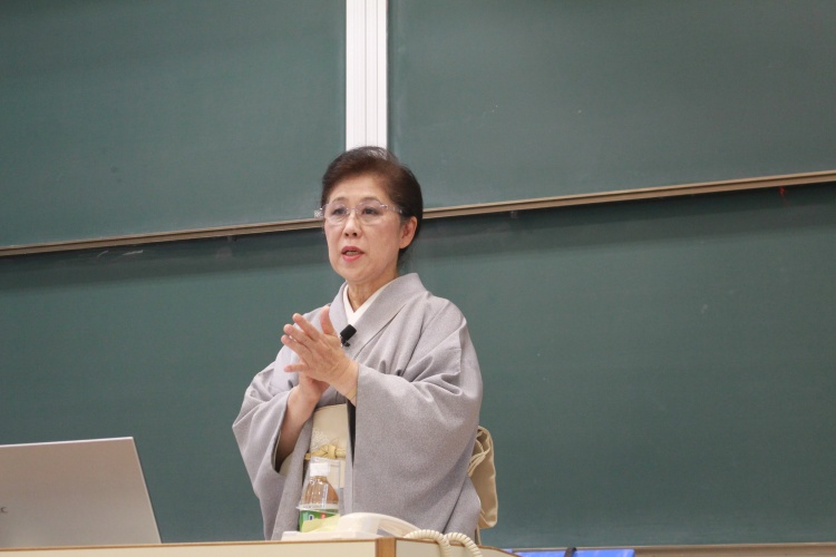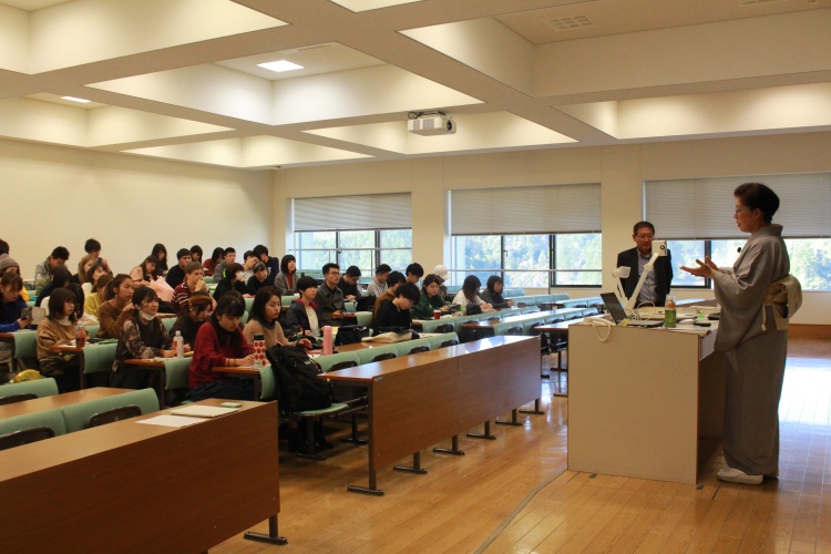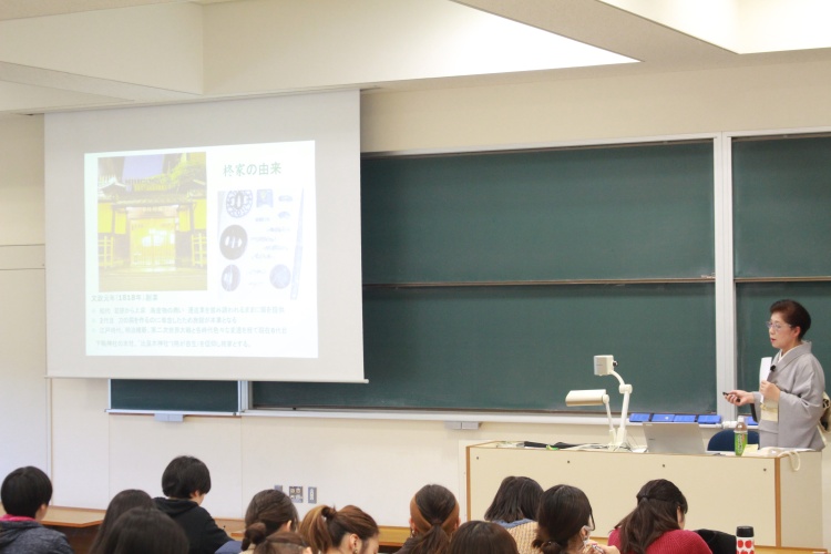 11月6日、文化学部「おもてなし文化論」の授業が開講されました。今回は柊家旅館6代目女将 西村明美氏をお招きし、「京のおもてなし」について学びました。